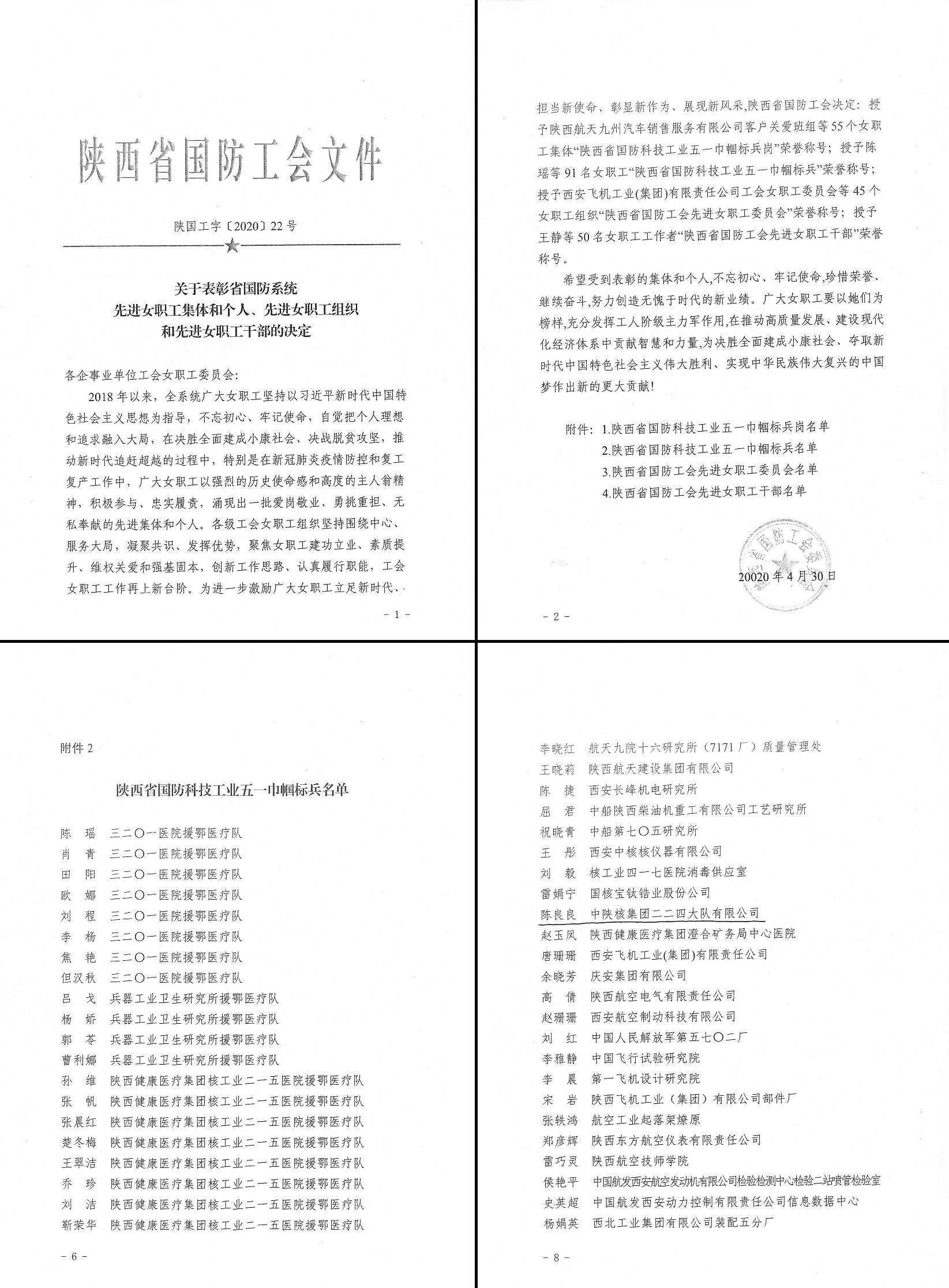 2020年4月30日,陜西省國(guó)防工會(huì)委員會(huì)授予中陜核測(cè)繪院總工程師陳良良同志“陜西省國(guó)防科技五一巾幗標(biāo)兵”榮譽(yù)稱號(hào)。