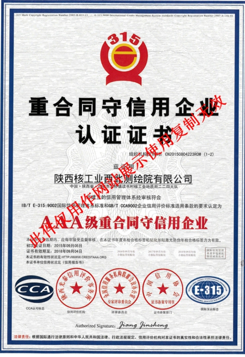 秋風(fēng)送爽,喜訊頻傳,陜西核工業(yè)西北測繪院各方面工作齊頭并進,繼中標(biāo)鎮(zhèn)巴項目、資質(zhì)升甲后,測繪院又一舉榮獲3A級質(zhì)量服務(wù)誠信單位認(rèn)證證書,3A級重合同守信用企業(yè)認(rèn)證證書,3A級信用等級認(rèn)證證書以及職業(yè)健康安全管理體系認(rèn)證證書共四項認(rèn)證證書。