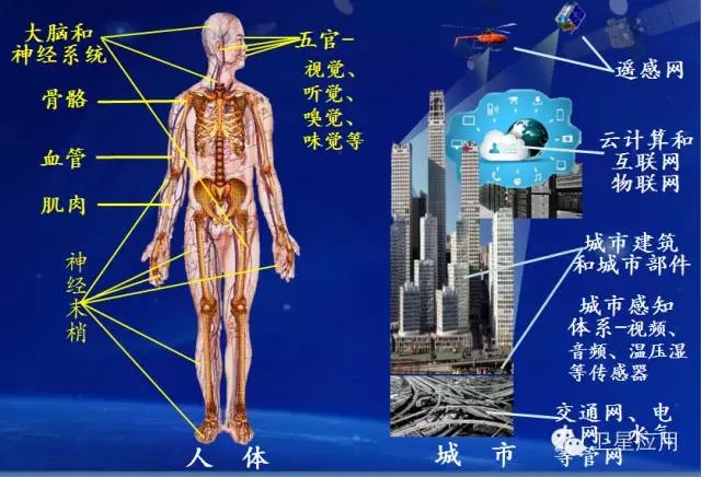 智慧城市在當(dāng)下還主要是一種發(fā)展愿景,是一個(gè)戰(zhàn)略思想。城市的智慧化,是一個(gè)巨大的科技、工程和生態(tài)體系。人為什么會(huì)有智慧?首先必須有眼、耳、鼻、這些感官(在很大程度上具有遙感的功能)外,還有分布在人體全身各個(gè)部位上超過十億(109)個(gè)感知細(xì)胞或神經(jīng)末梢,它們無時(shí)無刻不在感知或收集著來自各方的信息,這些信息經(jīng)人體的神經(jīng)系統(tǒng)傳輸至大腦(處理中心),經(jīng)大腦分析并做出決策的信息在經(jīng)神經(jīng)系統(tǒng)傳遞到人體的相關(guān)肌肉、骨骼、臟器等來執(zhí)行。這一系統(tǒng)是相互緊密連接的、是自我學(xué)習(xí)、自我完善的,這就是知識(shí)的積累過程,即人的一生也是集聚知識(shí)或智慧的一生。