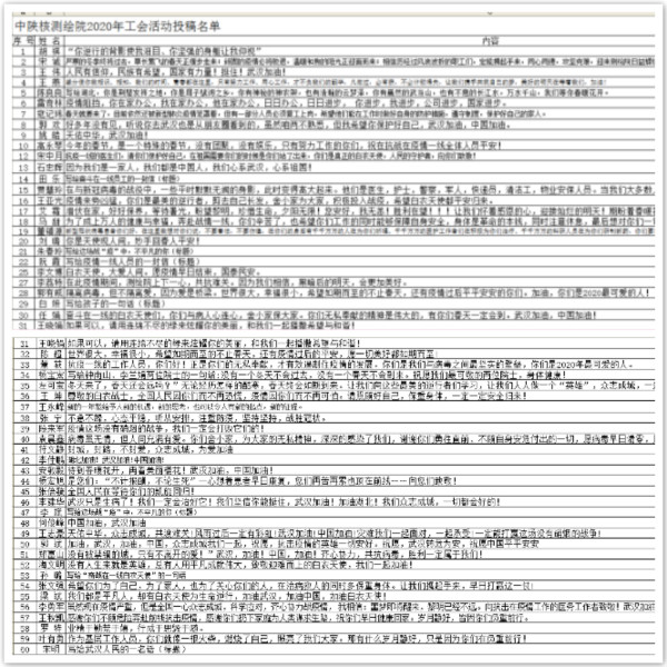 新型冠狀病毒感染的肺炎疫情防控特殊時期,為引導廣大職工保持身心健康,積極做好復產(chǎn)復工準備,提高團隊的凝聚力和戰(zhàn)斗力,近日,中陜核測繪院分會組織廣大職工開展了“為愛守護 同心戰(zhàn)疫”線上語言類作品征集活動。公司廣大職工紛紛響應測繪院分會號召,以《寫給……的一句話》為題,積極參與投稿。