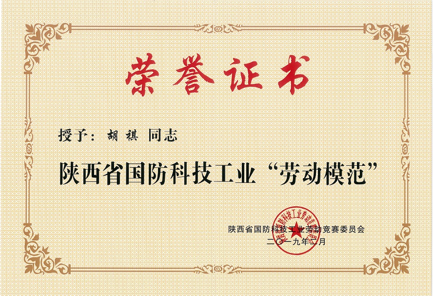 胡祺同志榮獲首屆“陜西省國(guó)防科技工業(yè)勞動(dòng)模范”榮譽(yù)稱號(hào)