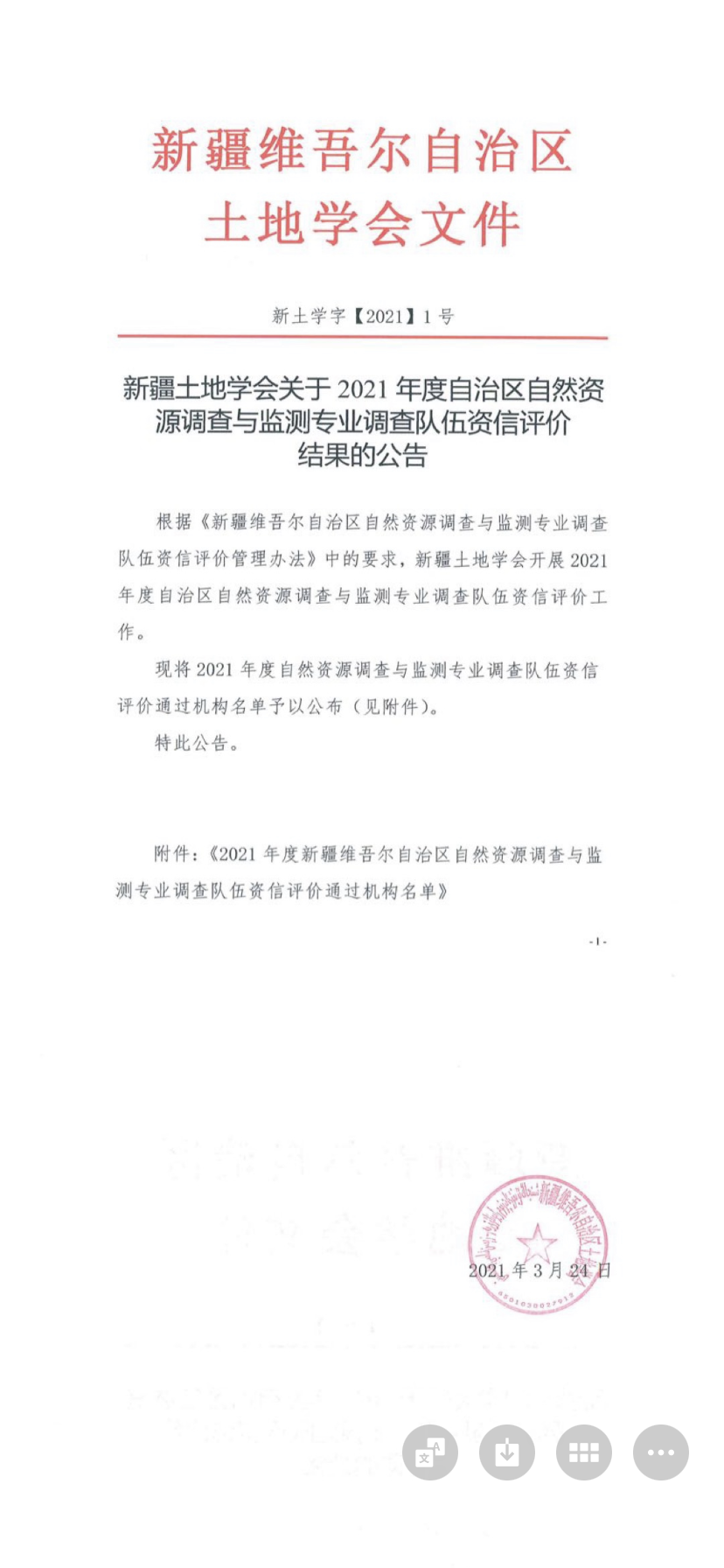 近日,新疆維吾爾自治區(qū)土地學會2021年3月24日公告發(fā)布,在新疆土地學會組織開展的2021年度自治區(qū)自然資源調(diào)查與監(jiān)測專業(yè)調(diào)查隊伍資信評價中,中陜核工業(yè)集團測繪院有限公司新疆分公司順利通過評審。