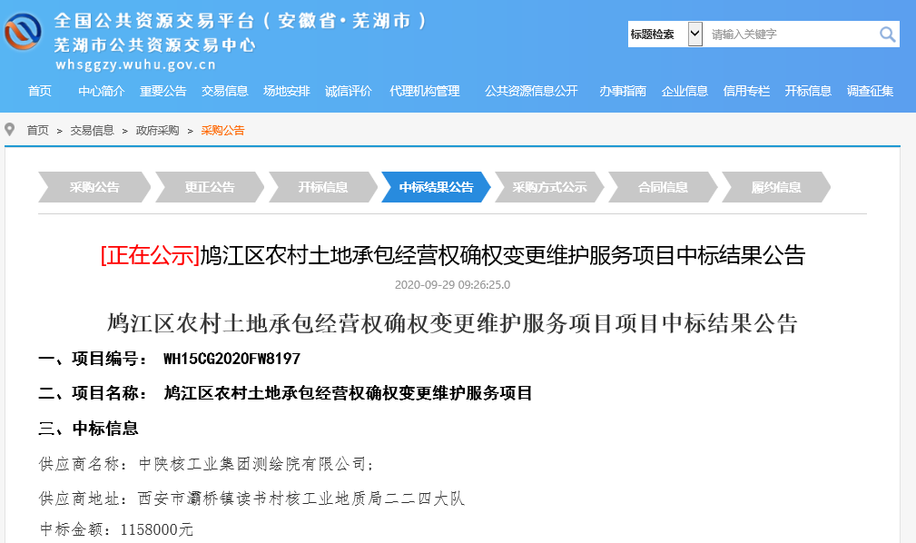 雙節(jié)獻(xiàn)禮,9月29日,從蕪湖市公共交易資源中心獲悉,測(cè)繪院以絕對(duì)的優(yōu)勢(shì)中標(biāo)鳩江區(qū)農(nóng)村土地承包經(jīng)營(yíng)權(quán)確權(quán)變更維護(hù)服務(wù)項(xiàng)目,中標(biāo)總價(jià)115.8萬(wàn)元。本次項(xiàng)目工作任務(wù)是對(duì)現(xiàn)有的土地承包合同、權(quán)屬證書及已下發(fā)的土地承包經(jīng)營(yíng)權(quán)證書為依據(jù),對(duì)需變更地塊、暫緩確權(quán)地塊、漏確權(quán)地塊等進(jìn)行調(diào)查,并對(duì)已確權(quán)農(nóng)戶合理的變更需求及時(shí)進(jìn)行變更換證業(yè)務(wù)辦理。