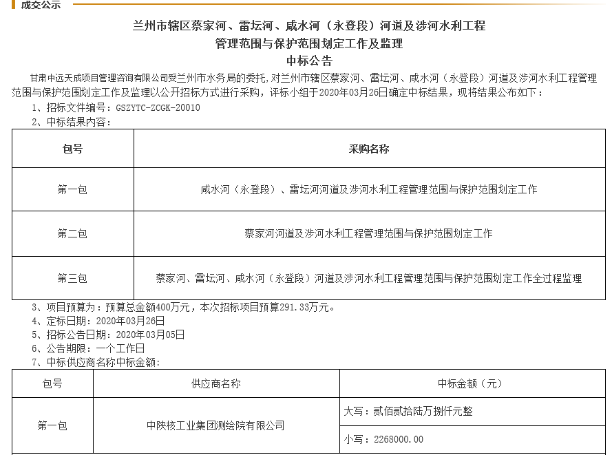 3月26日中陜核測繪院成功中標(biāo)“蘭州市轄區(qū)蔡家河、雷壇河、咸水河(永登段)河道及涉河水利工程管理范圍與保護(hù)范圍劃定工作第一標(biāo)段”(簡稱蘭州河湖劃界項目),合同額226.8萬元。截止今天,三個工作日公示期已滿。