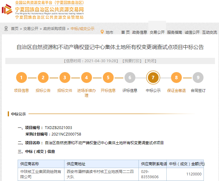 近日從寧夏回族自治區(qū)公共交資源交易網(wǎng)獲悉,中陜核測(cè)繪院以112萬(wàn)元的價(jià)格中標(biāo)自治區(qū)自然資源和不動(dòng)產(chǎn)確權(quán)登記中心集體土地所有權(quán)變更調(diào)查試點(diǎn)項(xiàng)目(一標(biāo)段)。